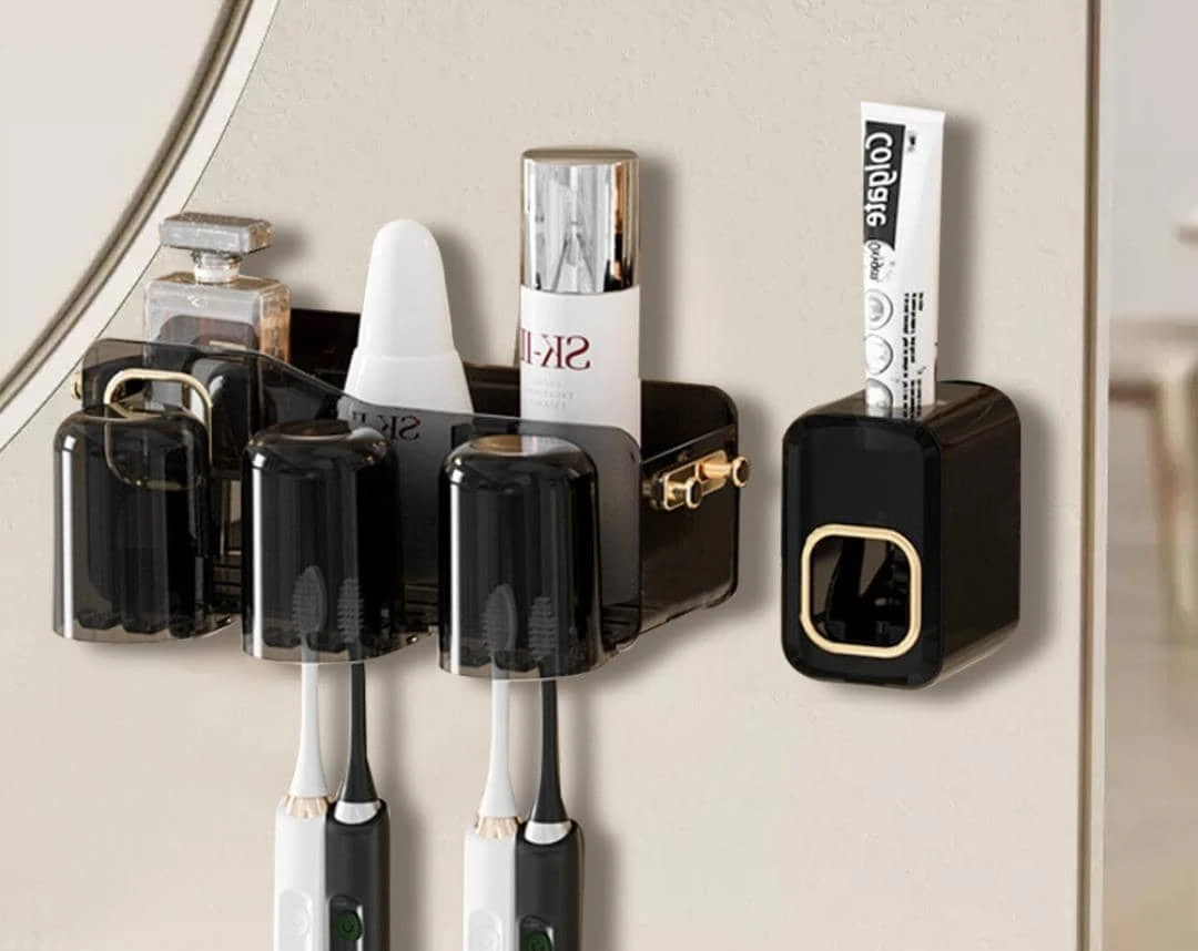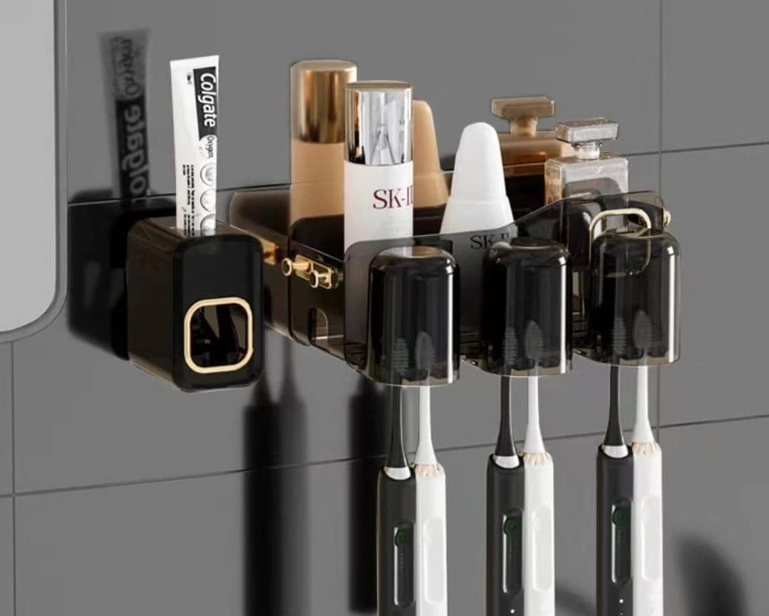 في قلب هذا الحمّام العصري، يبرز منظم جداري أنيق يجمع بين الفخامة والوظيفة. تصميمه الأسود المطعّم بالذهبي يمنح المكان لمسة راقية،بينما يوفّر ترتيبًا مثاليًا لأدوات العناية اليومية.