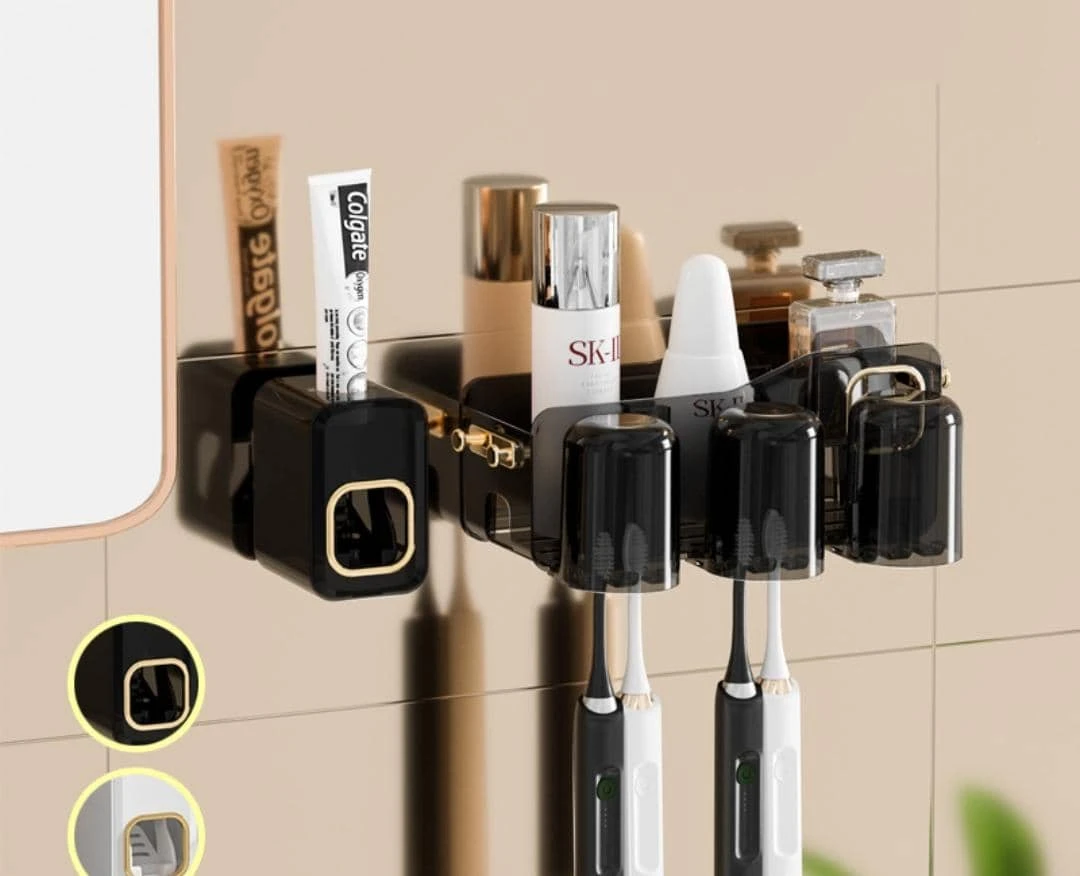 في قلب هذا الحمّام العصري، يبرز منظم جداري أنيق يجمع بين الفخامة والوظيفة. تصميمه الأسود المطعّم بالذهبي يمنح المكان لمسة راقية،بينما يوفّر ترتيبًا مثاليًا لأدوات العناية اليومية.